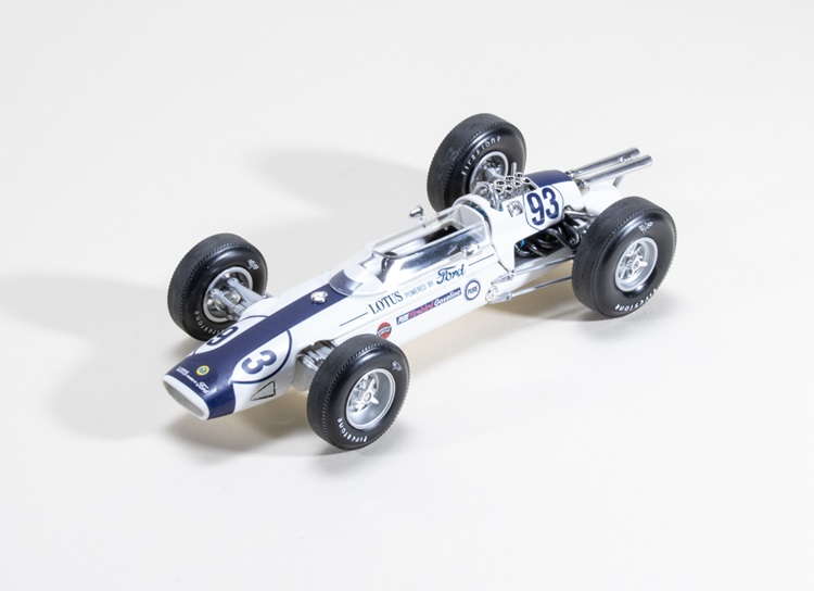Dan Gurney approached Team Lotus with an idea for an Indianapolis 500-winning design that included a Ford V8 that eventually bore fruit as the Lotus 29. Matt built his 1/25 scale model from an MPC kit, shaving the body and wiring the engine. He painted with Tamiya Pure White and dressed the race car in markings from Indycals.