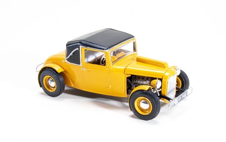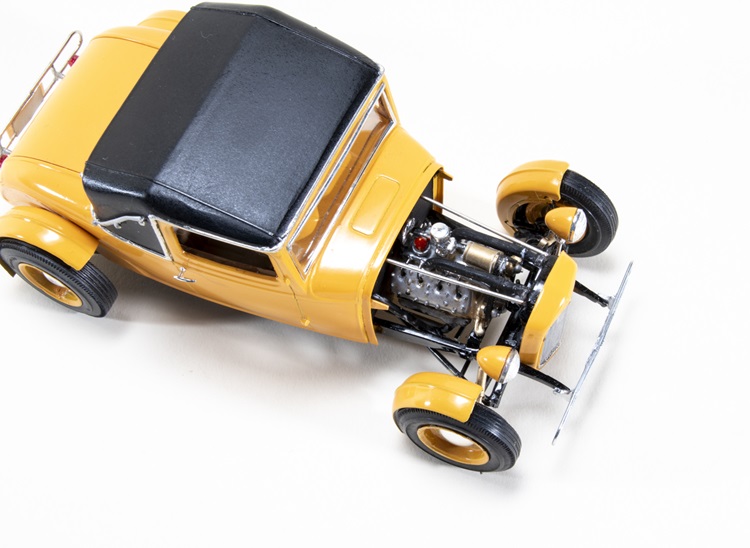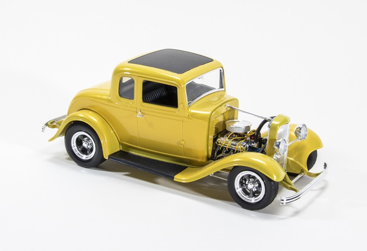 Bob’s Revell 1/25 scale 1932 Ford five-window coupe wears a juicy Tiki Paints Pineapple Pearl finish over Mr. Surfacer 1000 primer. He wired the engine and detailed the frame and rims.