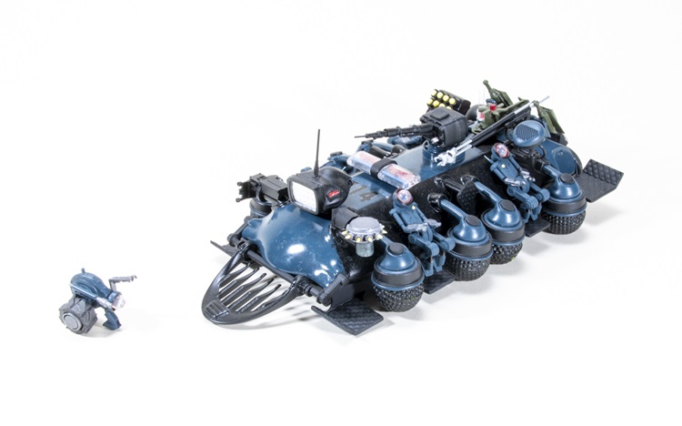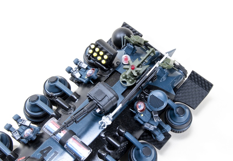 Victor calls this 1/25 scale unit the Autonomous Amphibious Urban Assault Vehicle. Coming completely from his imagination, Victor scratchbuilt this model. It includes a bomb-sniffing “robo” dog, wheels made from Nerf bullets, motors derived from earbuds, four 8-foot-tall robot officers, a .50-caliber machine gun, water cannon, concussion rockets with launcher, and a plethora of equipment fit for a dystopian future cityscape.