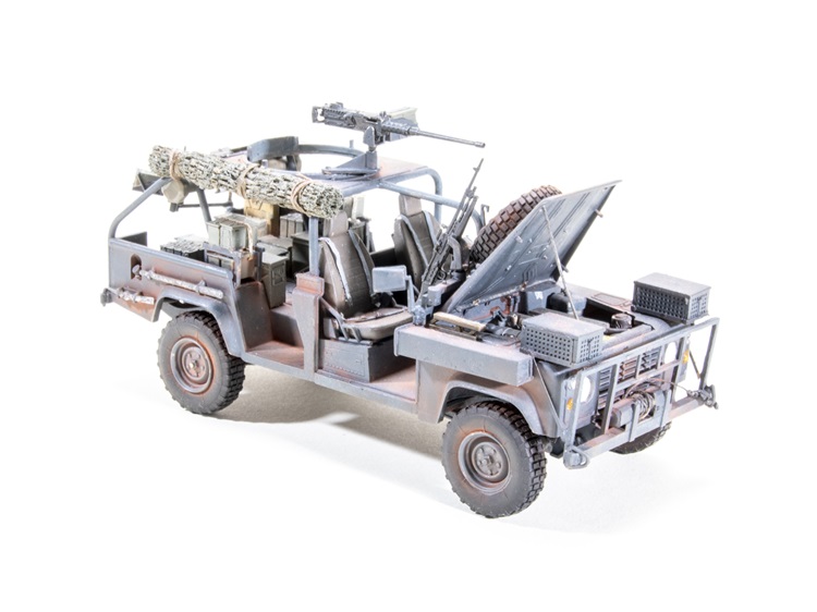 Maynard added gauze nets to his Ranger Special Operations Vehicle (RSOV), which he built from a HobbyBoss 1/35 scale kit. Model Master enamels provided the realistic colors and Maynard used ink-and-alcohol washes and pastels to provide believable weathering.