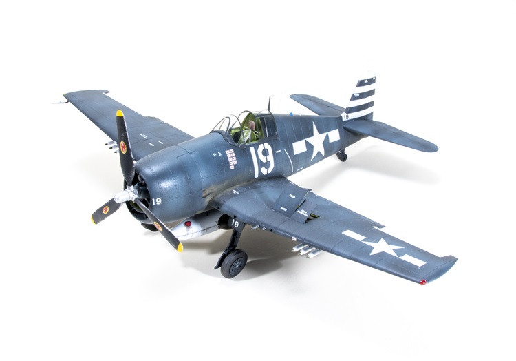 Tom dressed his Trumpeter 1/32 scale F6F-5 Hellcat for service as part of the USS Randolph carrier group that participated in the Iwo Jima Allied air attacks before the Marines landed on Feb. 9, 1945. Quinta 3D decals improved the cockpit, and resin machine guns replaced the kit’s weapons. Eduard masks kept the canopy glass pristine as he airbrushed on Tamiya and Vallejo acrylics. Pigments and Abteilung 502 artist oils provided dirt, streaking, and fuel and oil stains.
