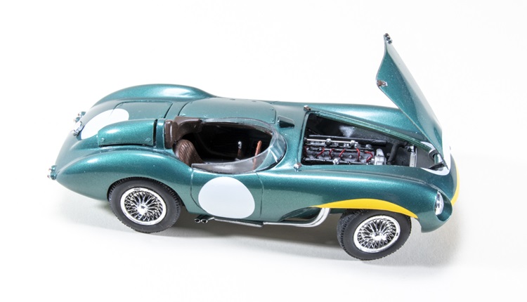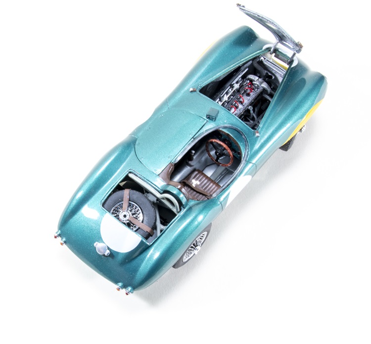 A Merit 1/24 scale 1953 Aston Martin DB3S kit served as a starting point for Stew’s model of a Le Mans 1953 works car. He opened up the hood, tonneau cover, and trunk, replaced the chassis with one from an AMT Cobra, and built the front suspension with parts from a variety of kits. The engine came from a Revell Aston Martin DB4.