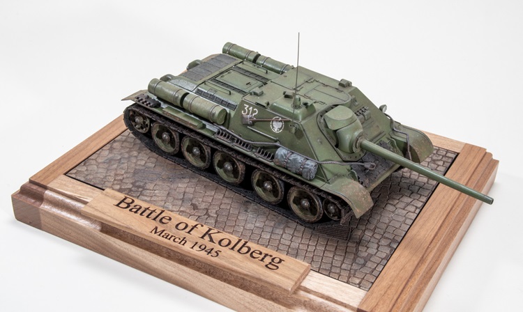 Bill built his Tamiya 1/35 scale Soviet SU-85 out of the box and painted it with Scale Colors acrylics. Dark artist-oil washes and post-shading brought the visual interest, as did a Bases by Bob wooden base to place the tank destroyer at Kolberg in 1945.