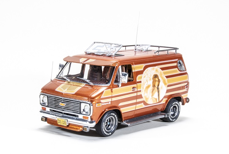 Much of the work Greg put into his Monogram 1/24 scale custom Chevy van is on the inside, like a custom overhead console with CB radio and eight-track tape deck, a center console to hold those tapes, a tuck-and-roll dash and door panels, a wet bar, mini fridge, and bed in back. Outside, he ran “warrior” side-pipe/running board exhausts, scratchbuilt a sunroof, roof vent, roof rack, and rear ladder. Testors One-Coat lacquers cover the exterior, and he marked his van with decals from two Monogram 1960 Chevrolet Impala lowrider kits.