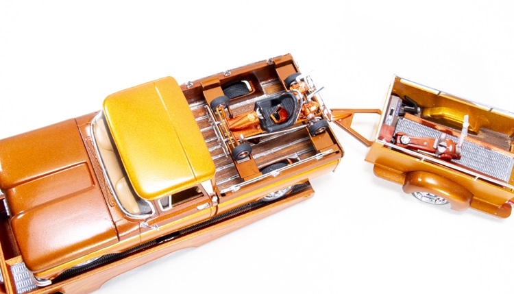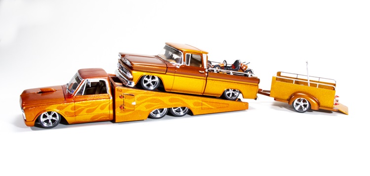 An AMT 1/25 scale 1972 Chevy wedge hauls a 1960 Chevy fleetside, which in turn hauls a go-kart and trailer. Tim lowered the suspensions on both trucks and the trailer, employed Pegasus wheels throughout, and dressed up the backend of the pickup with 1959 El Camino taillights. He reversed the mirrors on the wedge, mounting them from the roof. Tim painted with custom-mixed Tamiya colors, and he made a stencil on a Cricut to help him airbrush the flames.