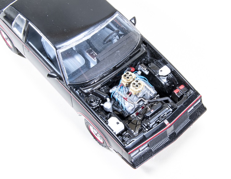 Deven swapped out the stock engine in his Revell 1/25 scale kit for a Pontiac 455 to model a 1983 Hurst Oldsmobile Cutlass street machine. He ran fuel and brake lines, added spark-plug wires to the engine, installed a custom exhaust, and placed a custom hood out front. He sprayed the two-tone black and silver finish from cans, masking in between for the demarcation.
