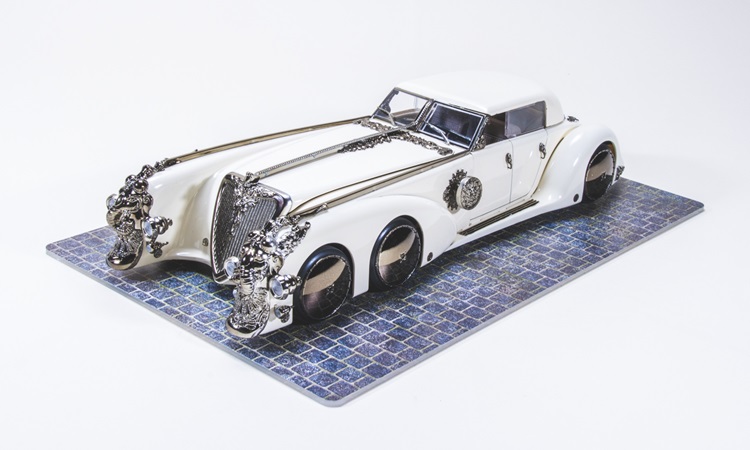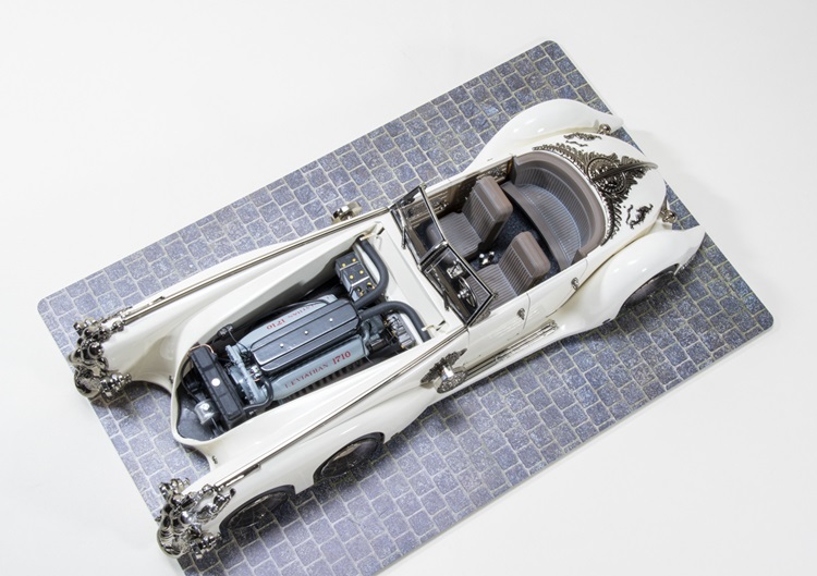 The Nautilus car from The League of Extraordinary Gentlemen movie has an unmistakable steampunk appearance. Andy Lowery built a Rave 1/24 scale kit, but wanted to take the model further than what the plastic out of the box provided. He cut open the hood and installed an Allison engine inside and named it Leviathan — appropriate, considering that this car belongs to the infamous Captain Nemo.