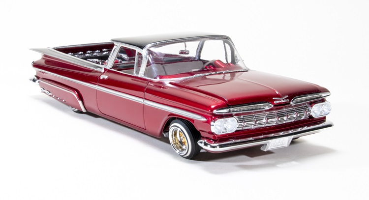 To get a 1959 El Camino built as a traditional lowrider, Wes Salazar seriously modified a Revell 1/25 scale 1959 Impala chassis and suspension to fit under the body and bed. He brought in and wired a 1941 Chevy engine and further customized the Camino with LMCP wheels, hydraulics, and skirts. A metallic gold served as a base for Tropical Glitz Merlot, and Tamiya Black made the perfect counterpoint.