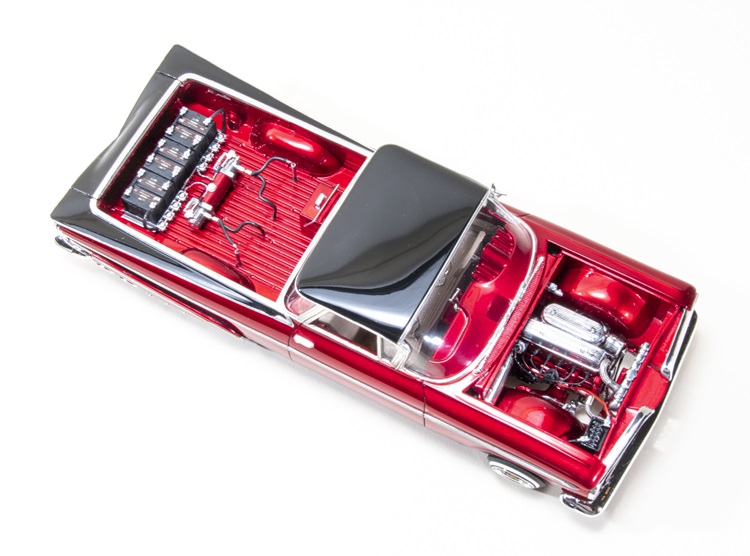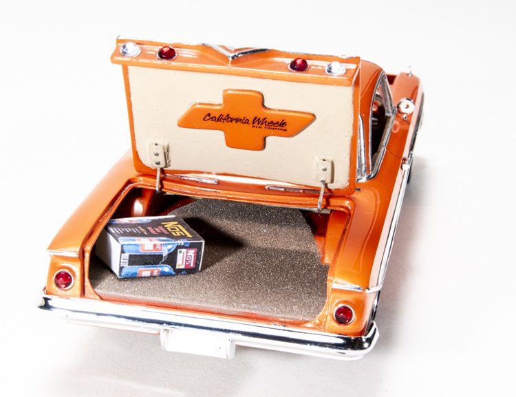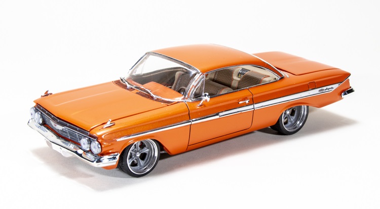 Modeling a Pro Touring car with a ton of horsepower, Sam Husk cranked up the creativity when modifying an AMT 1/25 scale 1961 Impala. He installed a 3D-printed engine, ran aluminum exhausts, opened and detailed the trunk, and put it all on top of Z-man wheels. House of Kolor Tangelo Pearl dresses the updated beauty’s exterior, while acrylics and Mr. Model upholstery decals liven the interior.