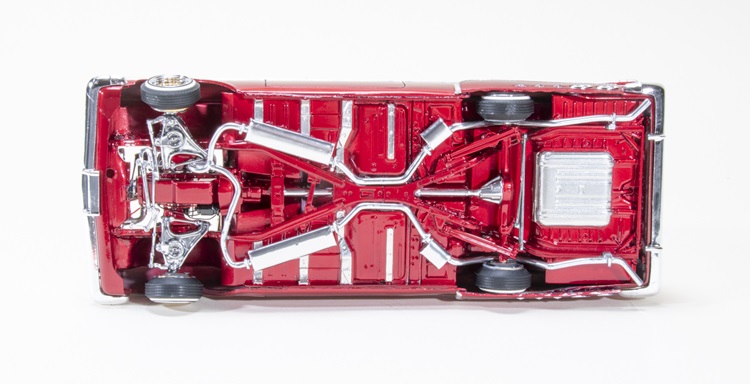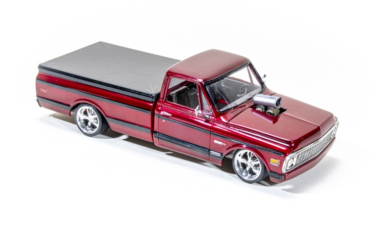 Mark Casto lowered an AMT 1/25 scale 1972 Chevy pickup, dropped in a 3D-printed engine up front, installed a coil, wired everything under the hood, and wedged 19-inch wheels under the four corners. He primed, painted with MCW Velvet Red enamel, and masked to paint the trim Tamiya Gloss Black.