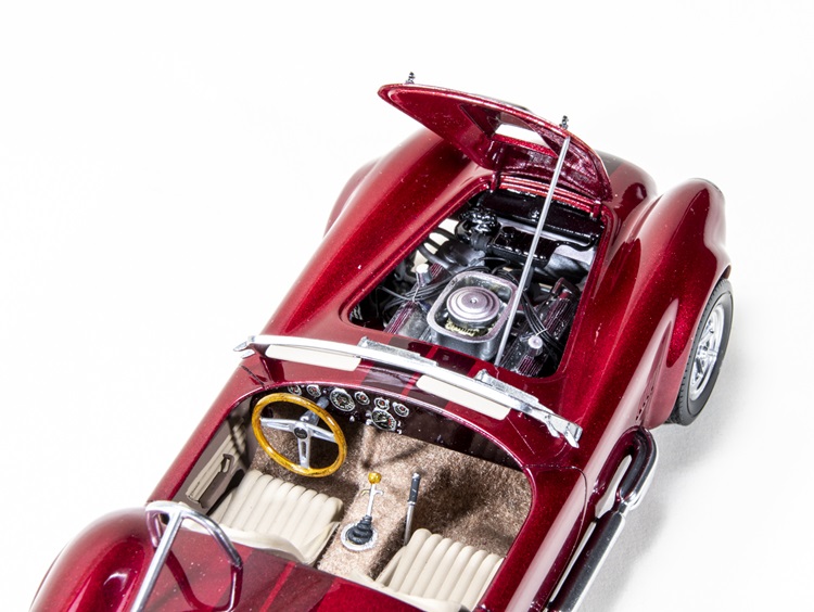 On his Revell 1/24 scale Shelby Cobra 427, Brian Burwell airbrushed a base coat of House of Kolor Gold and masked for the stripes, painting them HoK Lime Time. Removing the masks, he airbrushed the whole body HoK Brandywine Kandy and topped it all off with HoK Clear. Inside, he scratchbuilt the door cards, flocked the floors, and finished the steering wheel with a realistic wood finish.