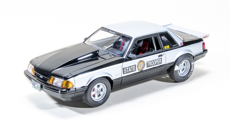 Chris Propst had an idea for a former police pursuit vehicle turned strip/street racer. Taking a Revell 1/25 scale 1990 Mustang NCSHP drag car, he modified it with 3D-printed nitrous bottles, MSD ignition box, nitrous lines, seat harnesses, and a parachute and mounts made from fishhooks. Under the custom decals is a silver and black finish over gray primer.