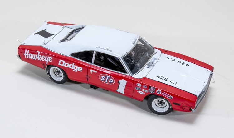 MPC and Revell kits supplied parts for Randy Derr’s 1/25 scale model of Ernie Derr’s IMCA Dodge Charger stock car. Randy altered the chassis to replicate the race car and banged up the body for race damage. Tamiya lacquers supplied the colors, and Randy weathered with acrylics and powdered pastels.