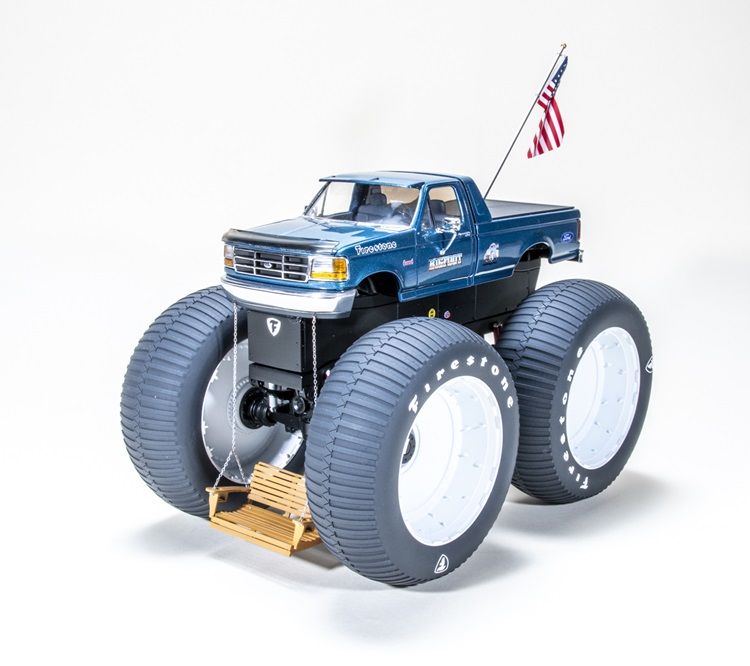 Bigfoot 5 arrived in 1/25 scale with Kreg Wood. This enormous model was built from 3D-printed parts and an AMT 1995 Ford F-150 XLT with a long bed. The chains for the porch swing came from a tow-truck kit. Depicting how Bigfoot was displayed at the 2003 Ford 100th anniversary celebration, Kreg painted the body MCW Jamaica Blue enamel with 2K clear on top. The tires were painted Tamiya Rubber Black, and the chassis is all Tamiya Semigloss Black.