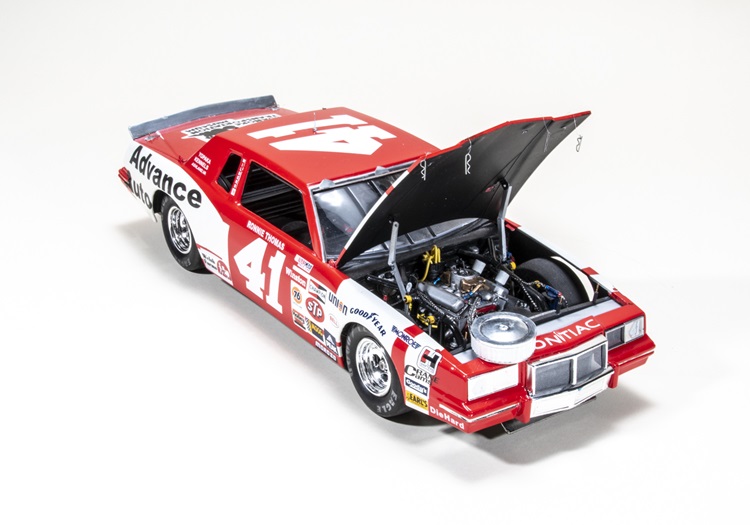 B. Wade Brooks’ finished his AMT 1/16 scale 1981 Pontiac Grand Prix by detailing the engine and cockpit with aftermarket photo-etched metal, vinyl lines, and braided hoses. To depict the 1983 effort of his friend Ronnie Thomas’ NASCAR entry, he painted the body Tamiya Bright Red, White, and Clear. Citadel Nuln Oil gave the engine an appropriately used appearance.