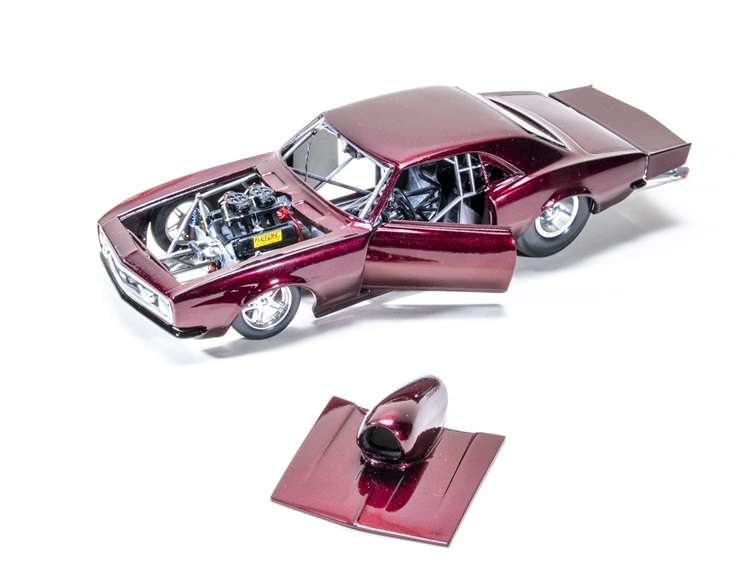 The only thing that came from a kit on Leonard Harrod’s 1/25 scale 1968 Camaro outlaw was an AMT body. The chassis was 3D-printed, the wheels come from Dancing Bear Scaled Components, and Futurattraction supplied Lenco transmission, struts, and brakes. Okay, and the engine came from a Revell Pro Stock kit. He painted the body Tropical Glitz Seductive Cherry and protected it with two coats of clear gloss.