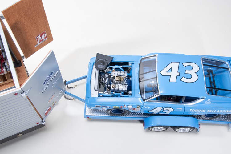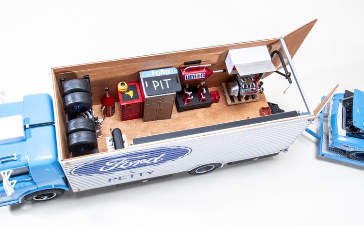 To model Richard Petty’s 1969 Torino Talladega and Ford tow rig, Mark Gregory turned to 1/25 scale AMT and Polar Lights kits. He replaced the stake bed on the truck with a van, lowered the wheel wells per the real truck, and replaced the roll-up rear with hinged doors. On the car, Mark opened the trunk and parked Plastic Performance Products tires and wheels underneath. Inside the van, Mark finished with wood paneling and outfitted it with all the tools and accessories you’d expect for race day.