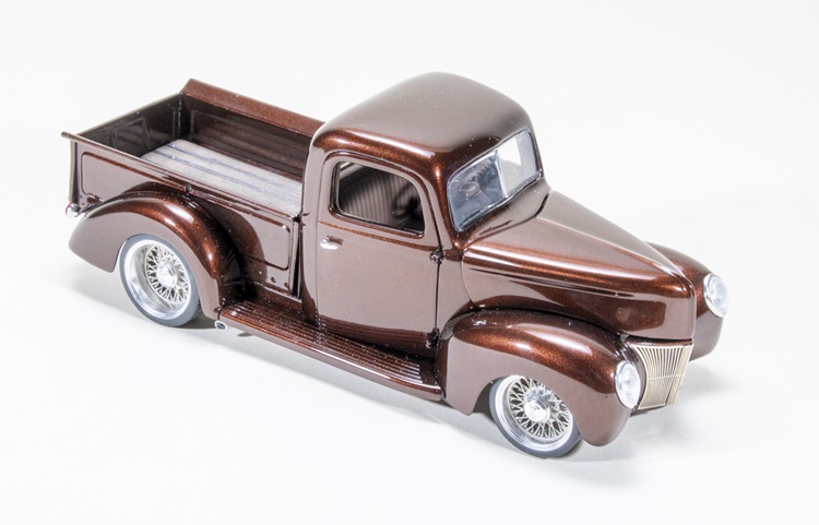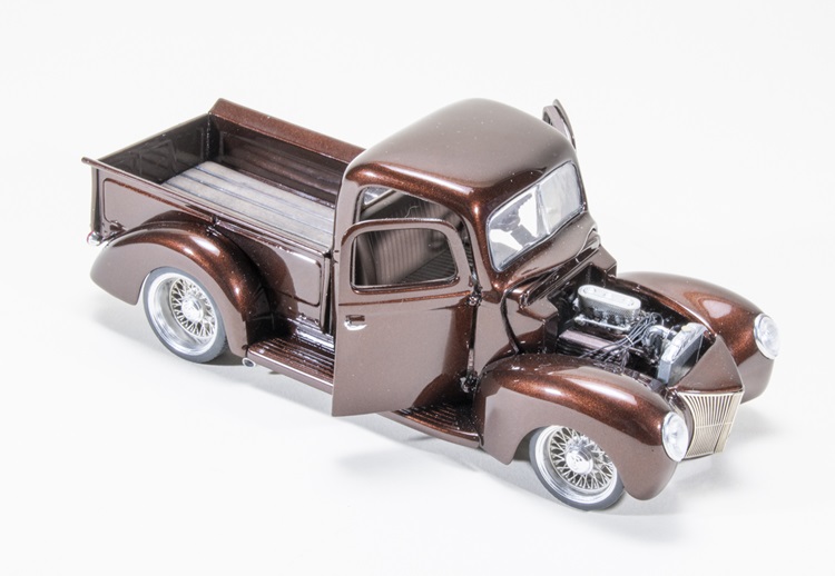 Robert Langoni shaved the body of a Monogram 1/24 scale 1940 Ford for his custom pickup. Underneath is a 1937 frame and suspension, and Robert upgraded with photo-etched metal parts and 3D-printed wheels. In back is a bed floor made from real wood.