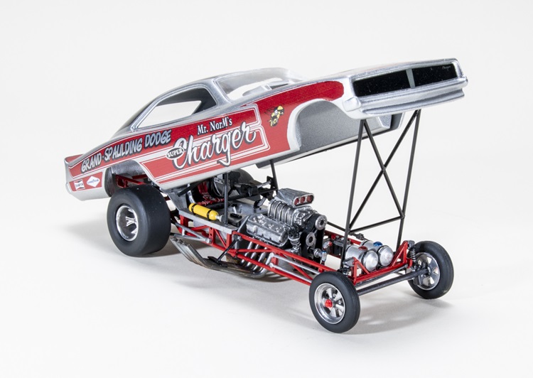The Polar Lights 1/25 scale Mr. Norm’s ’69 Dodge Charger Funny Car dates back to 1999, and Seth Brock does the kit proud. He built the model box stock, other than replacing the decals and removing all the factory chrome to repaint it with Revell Chrome. Seth used all manner of brands and paint types when finishing his replica, including acrylic, enamel, and lacquer paints from Tamiya, Revell, Mr. Hobby, Alclad II, and Testors.