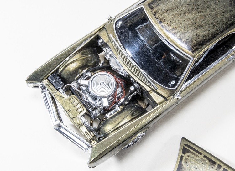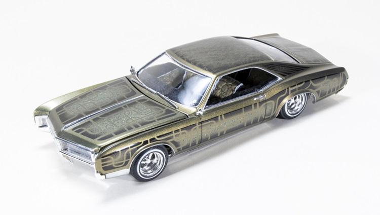 Raiden Cowan wanted to build a period-correct, early-’70s lowrider and went with an AMT 1/25 scale 1966 Buick Riviera to do it. First, he dressed up the interior with crushed velvet and foam biscuit tuck upholstery. Outside, he custom mixed a “green pearl” color and then masked patterns by hand. Catch that cool concrete look at the center of the panels! When he was finished, Raiden encased his work under glass-like 2K clear.