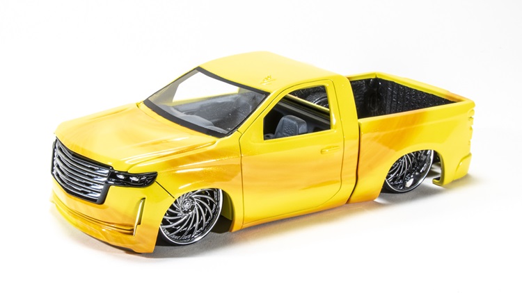 This is a JPS Customs 1/24 scale 2022 “Cadirado” built by Benjamin LeGrand. He opened the hood on the 3D-printed kit, added a fully detailed engine, supplied the chassis underneath with many machined aluminum parts, and improved the interior. The sunny finish is a custom color made with House of Kolor Shimrin2 lacquers. Benjamin then blanketed the paint job under 2K clear.