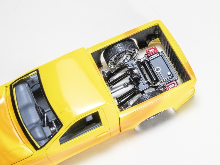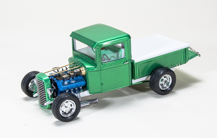 Dennis Witthuhn made extensive changes to an AMT 1/25 scale 1934 Ford pickup, including a fully customized frame, 3D-printed engine parts, hinged tonneau cover, and tailgate with working latches. Tropical Glitz Cilantro Green rests over Galactic Silver for the verdant paint job, and is matched by the two-tone upholstery inside.