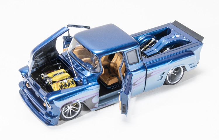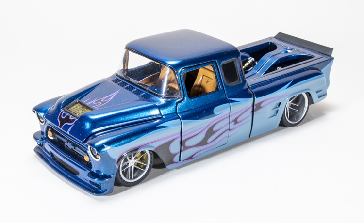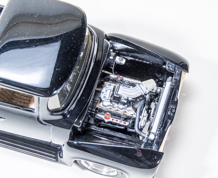 Jeremy Schul’s 1955 Chevy two-door wears a worn finish of metallic green and pistachio fingernail polish. To achieve the weathered look for his 1960s hot rod, he airbrushed on layers, introducing pigments as he went. He wired and plumbed the V8 under the hood and added an Indian blanket to the bench seat.