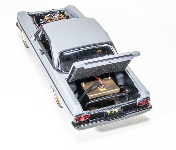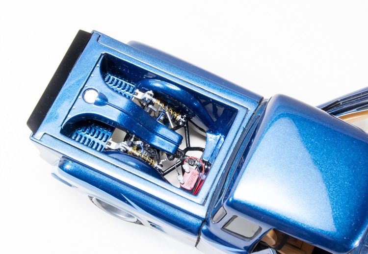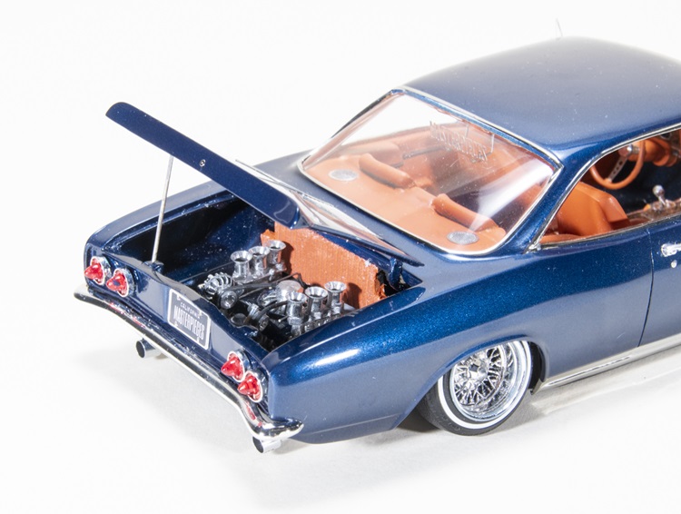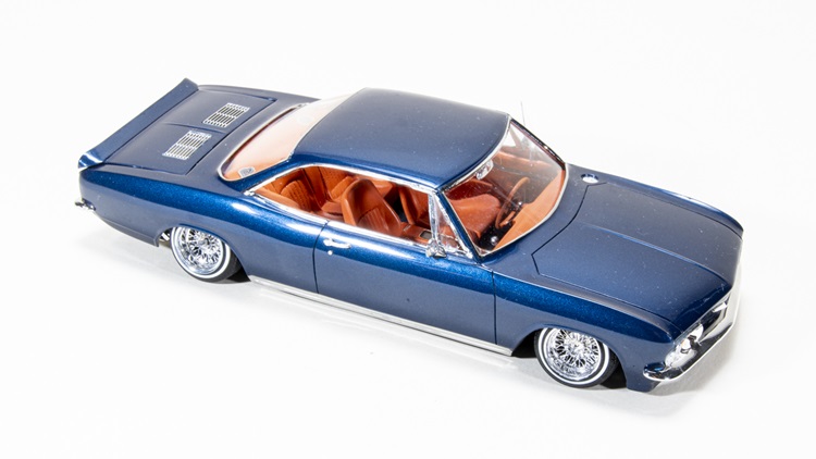 Inspired by vintage European car design, like the Ferrari Lusso, Jorge Ramos lowered the suspension, made a custom front valance, and completely reworked the interior of his AMT 1/25 scale 1969 Corvair. He airbrushed the body Gravity lacquers and picked out the doors and other panel lines with a black pinwash. The trunk opens to reveal the custom details in back.