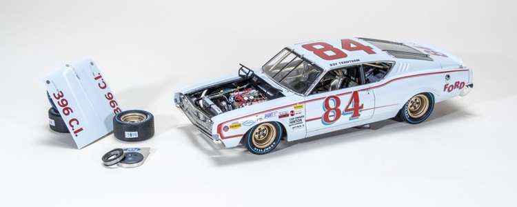Taking a Polar Lights 1/25 scale Mercury Cyclone, David Hawkins modeled the 1968 Ford Torino driven by Roy Trantham. He dropped the car’s nose and replaced the kit wheels, tires, and decals with others from Plastic Performance Products.