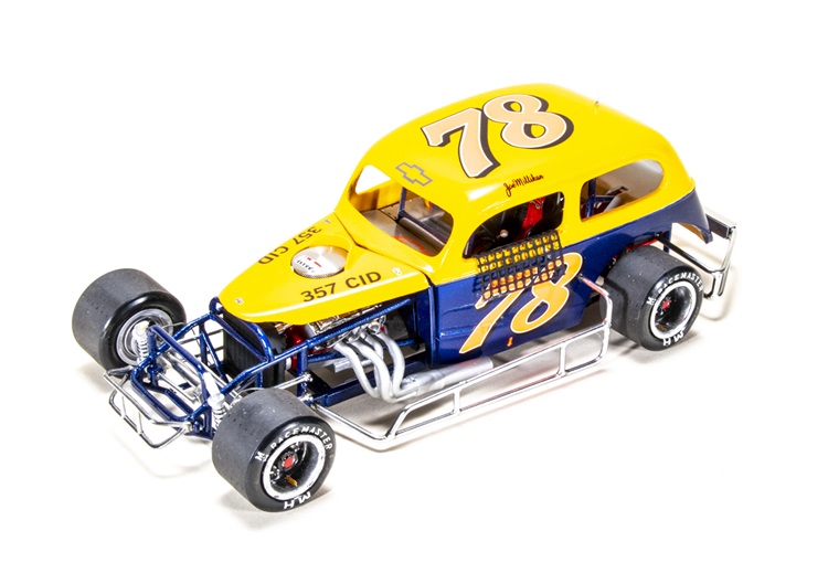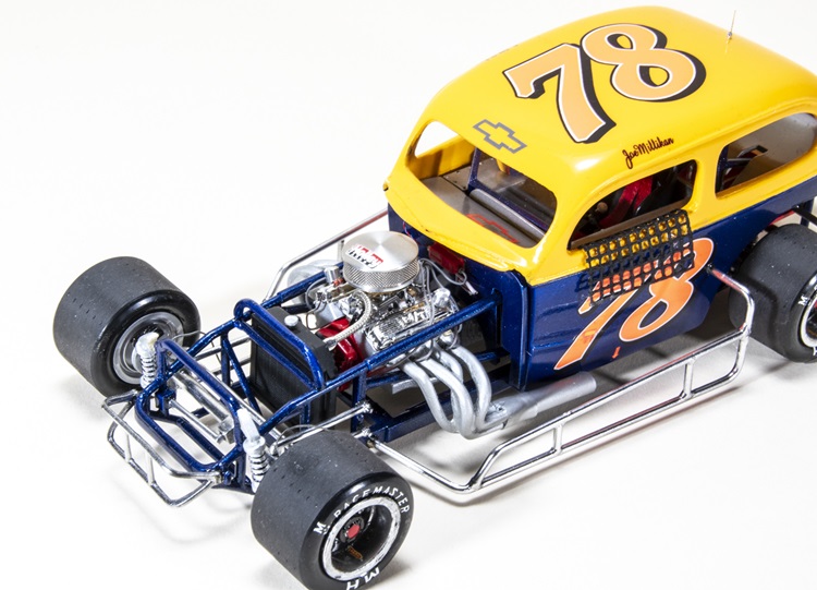 To turn an AMT 1/25 scale 1935 Chevy sedan into a modified racer, Ken Denza replaced the wheels and tires, called in a new body from Big Donkey Resin and added the air dam on the hood, installed plenty of lines and hoses, swapped in a new intake manifold and carburetor from his spares, and attached a windshield. That’s not even close to everything! The driver got a NASCAR seat with five-point harness and FRW Speed Equipment safety net, helmet, and fire extinguisher. We could go on and on, but the point is Ken put a ton of effort into a singular modified replica, and it shows!