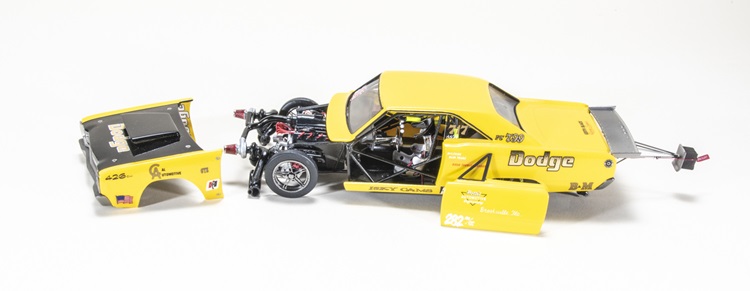 Mike Janas’ custom drag car was kitbashed from a Revell 1/25 scale 1968 Dodge Dart and the chassis from an STP Firebird Pro Stock. The engine is an Iceman Collections Twin Turbo Hemi, and the tires and wheels came from MCV Products. He airbrushed several coats of Tropical Glitz Yellow Submarine before laying on the decals and the 2K clear coat.