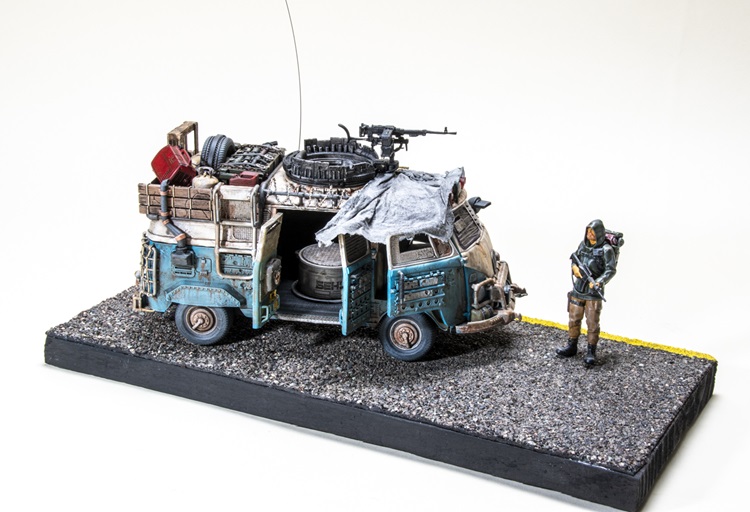 This post-apocalyptic 1/24 scale VW bus and figure are 3D-printed and painted by Ryan Hutson with Scale Finishes lacquers.