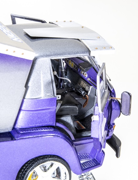 You may not be able to see it under the Voltex Racing body mods, but there is a Fujimi 1/24 scale 1986 Toyota MR2 Supercharger down in there. Steven Johnson added the aftermarket modifications and cut down and moved the Toyota’s back window. He painted his blacktop beauty Tamiya Metallic Red, and even placed scale-sized GoPros on the door and rear wing to capture all the high-speed action.