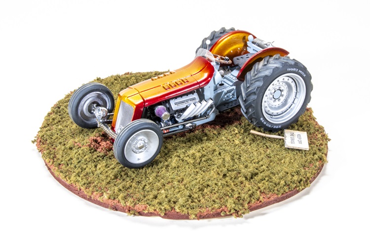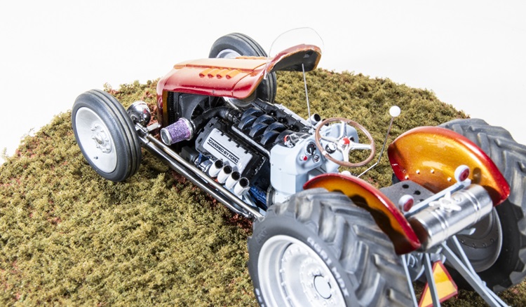 Irvin Arter Jr. brought an Iceman Collections 3D-printed Ford 8N kustom tractor to the show. He moved the axle forward 1/2 inch and added brass tubing to extend the radius rods. Irvin painted the fiendish Ford Tropical Glitz Pineapple Lollypop with Candy Apple fades. The front grille is Scale Scenic aluminum micro mesh, and you can see 3D-printed Moon pedals and battery clamps from MCV.