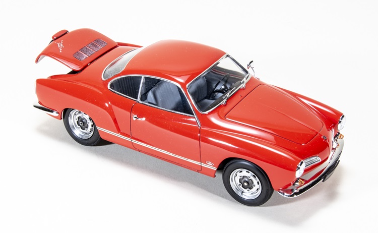 For a factory-stock 1966 Karmann-Ghia, Eric Nordstrom turned to a Tamiya 1/24 scale kit. He wired and plumbed the engine beneath the rear bonnet and painted with MCW Red Orange.