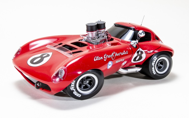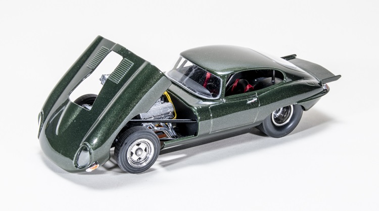 Harvey Kealer is 74 years old and took up building models less than three years ago. Here, he’s combined a 1967 Chevelle pro street rear end with a Jaguar XKE for a special 1/24 scale drag car. Harvey scratchbuilt the firewall, roll cage, and body extension. The metallic green finish came from Model Car Works.