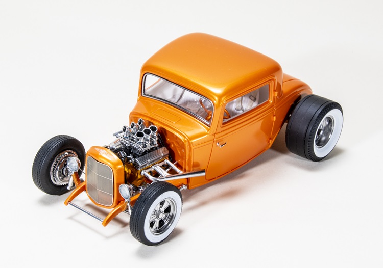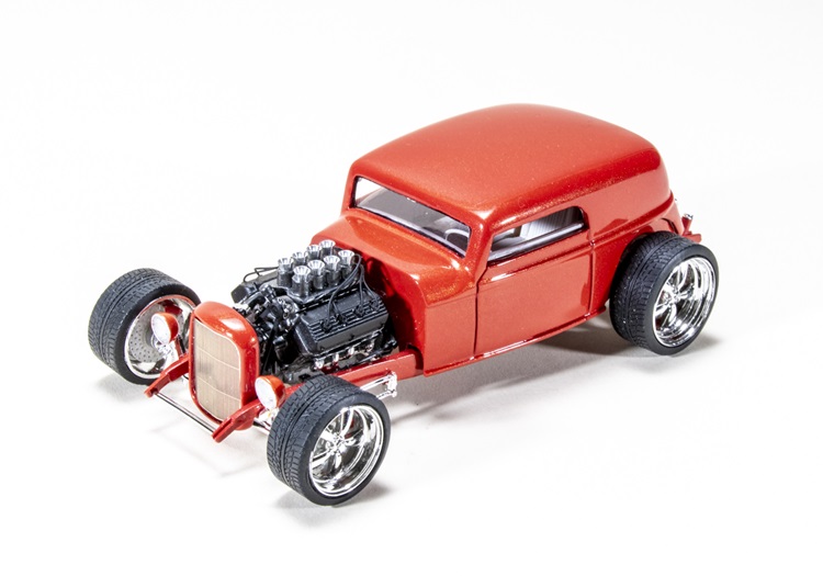 Looking for something a little different from just a sedan, Donald Betterton welded a 1932 Ford sedan delivery body from Jimmy Flintstone onto a running gear from a Revell kit and suddenly found a fiery hot rod on his hands. Donald had to seriously modify the interior, wired the engine, and painted with a 50:50 mix of Tamiya Red and Orange that was then combined with a bit of Pearl Orange.