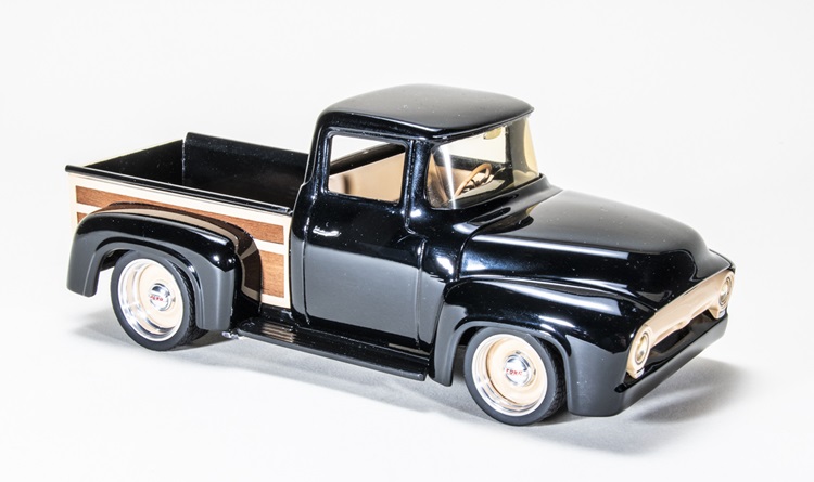 Fonzell Brown envisioned a SoCal shop truck and turned to a Revell 1/25 scale 1956 F-100 Ed “Big Daddy” Roth shop truck kit. He sealed the doors, decked the hood, and planked the truck bed and sides with wood from a cigar box. Testors Black and Cream put the final touches to this classy custom.
