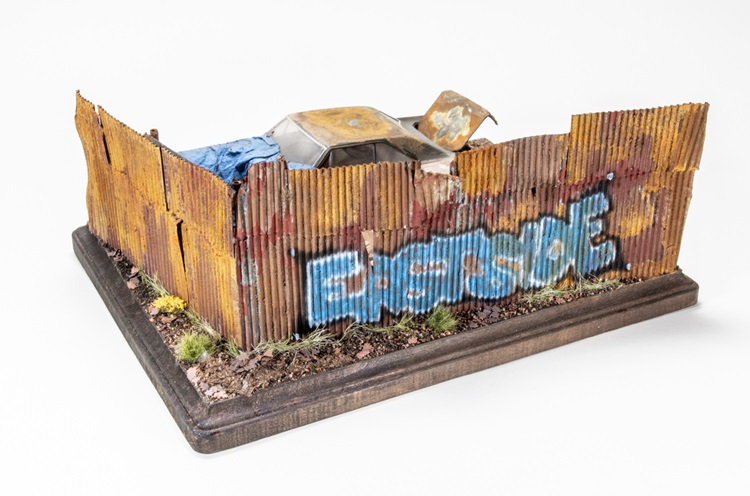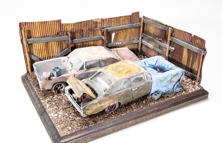 A pair of Dodge Darts rest (rust) in peace in Tim Brown’s Darts in the Backyard diorama. He used a pair of Revell 1/25 scale kits for the cars, opened the trunk on one, and added a milk crate, chain, and other detritus one might find in an old, forgotten car. Tim recycled an old award for the diorama base, hand-punched more than 1,000 leaves for the scene, and employed AK Interactive pigments and Ammo washes for weathering. The salt and hair-spray techniques scratched away and chipped faded paint on the cars and sheet-metal fence.