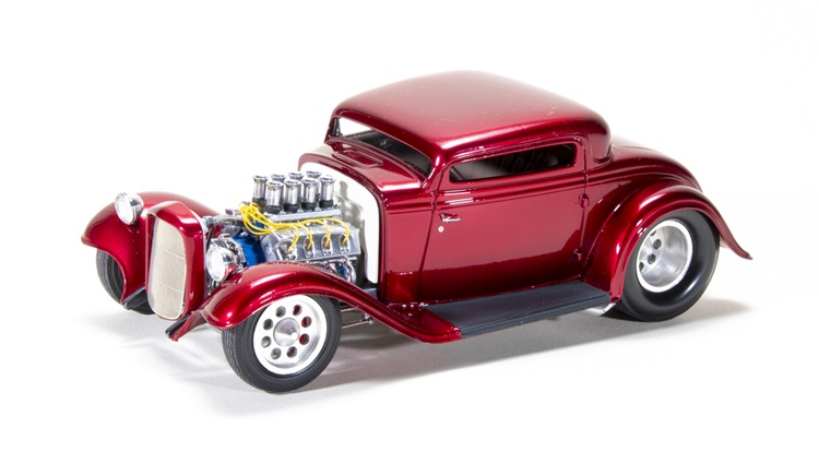 A chopped roof and channeled body give this pro street 1932 Ford coupe an absolutely menacing demeanor. Fred Henry painted his 1/25 scale hot rod House of Kolor Candy Brandywine over black primer and a metallic gold base. He wired the Boss 429 powerplant and upgraded with velocity stacks on top.