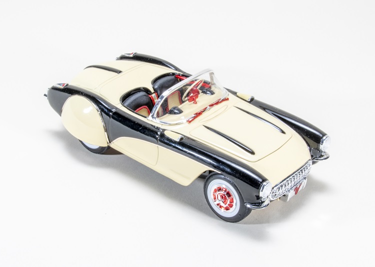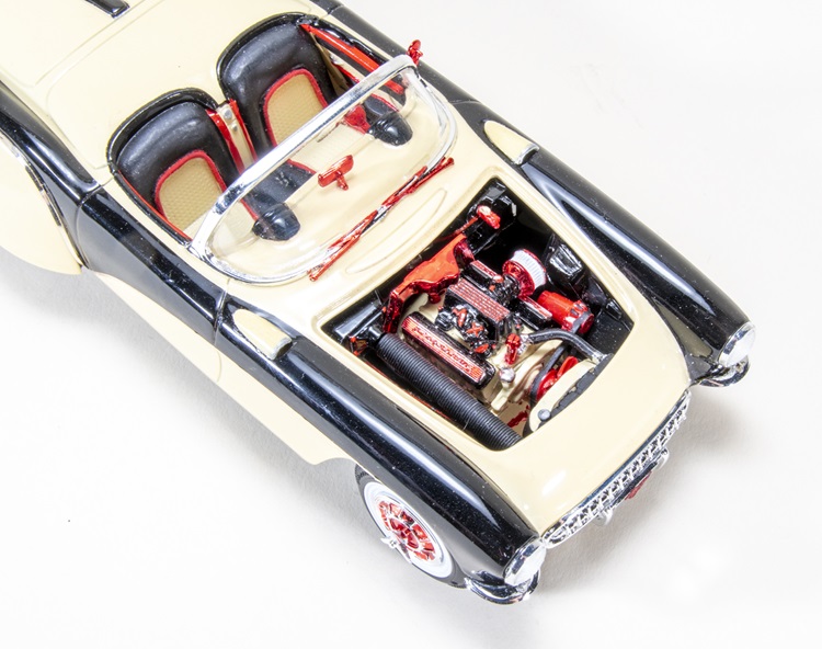 John calls this 1/25 scale beauty the Vettegatti — a vintage Bugatti with Corvette flare. He reworked an AMT Corvette kit with custom rear skirts, interior, and chassis. He tricked out the fuel-injected engine under the hood and couldn’t help but give the classic light yellow and black two-tone scheme extra spice with red accents.
