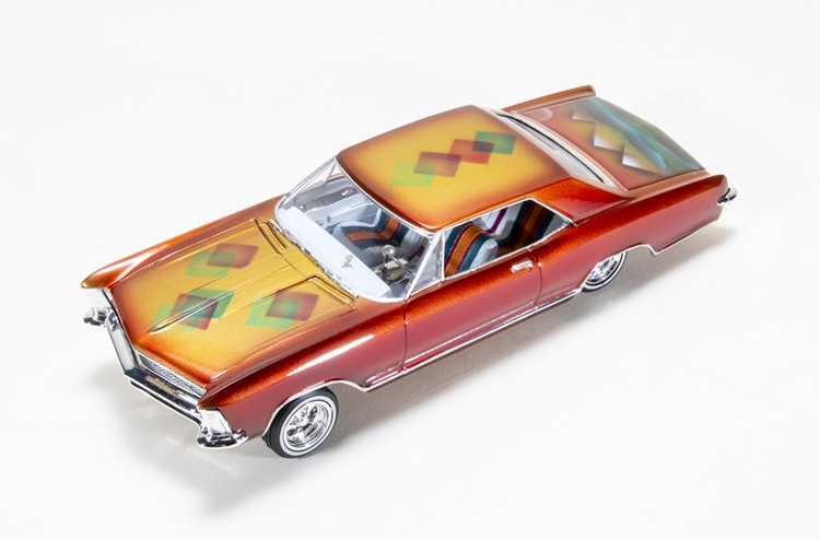 House of Kolor Pagan Gold, Champaign, and Tangerine combine for a delightful finish on Shadow’s AMT 1/25 scale 1965 Buick Riviera lowrider. He replaced the kit tires and rims with new ones from Hoppin’ Hydros and detailed the interior and undercarriage. All of the graphics were airbrushed, including the mural on the trunk lid.