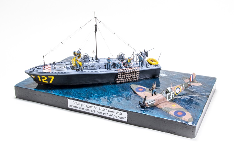 A Spitfire pilot waves thankfully as a “Whaleback” RAF rescue launch sidles up to give him a lift. The scene includes an Airfix 1/72 scale launch and Spitfire on a base made of foam insulation. Ihor opened the launch’s toe rails, simulated a rescue net, added vacuum-formed turrets, and coiled rope for the deck. For his first waterborne diorama, Ihor modeled the water with Liquitex Gloss Medium and Gloss Varnish, along with craft paints and UV resin.
