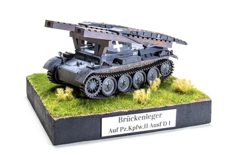 This unique Panzer II bridgelayer comes from a Bronco 1/35 scale kit. Chris bumped up the detail with a set of Friulmodel metal tracks. He primed with black Mr. Surfacer 1500 and then airbrushed Tamiya acrylics over it. Ammo washes and pigments handled weathering. The base was made of foam board with VMS Smart Mud, static grass, and tufts of vegetation from Gamers Grass.