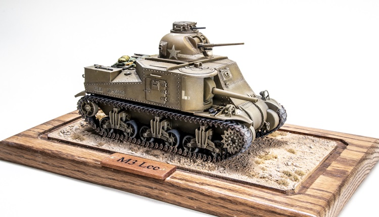 Modeling an M3 Lee in North Africa during World War II, Chris built a Tamiya 1/35 scale kit and improved it with turned-metal barrels, resin stowage, and wire cable. Vallejo and AK Interactive acrylics were airbrushed on for the camouflage and highlights, while washes heightened shadows. Pigment gave the model the appearance of driving around in blowing sands.