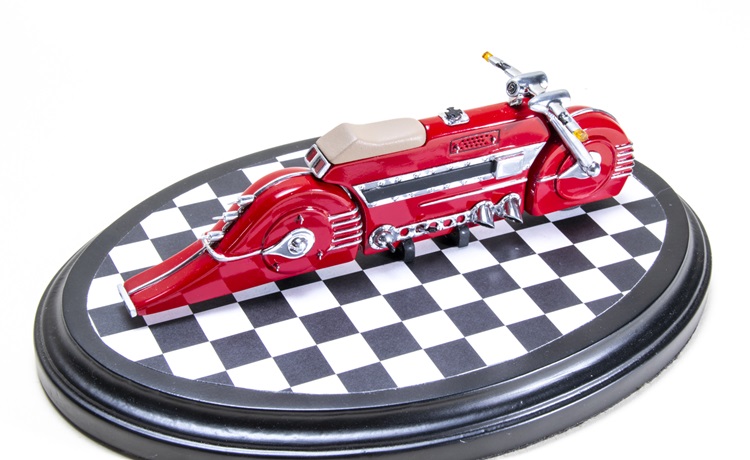 An artist’s illustration inspired Scott to scratchbuild his 1/16 scale Art Deco motorcycle. Plenty of care went into creating the miniature styrene masterpiece that he painted Tamiya Racing Red, Semigloss Black, and Clear. The chrome trim was hand-brushed with Revell Chrome. He painted the wooden base black and decorated the top with a checkerboard pattern.