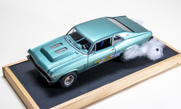 Scott basically reworked every aspect of a Revell 1/25 scale 1969 Chevy Nova to model his Yenko Nova. He sunk a 3D-printed 572 big-block Chevy between the front wheel wells and equipped it with spark-plug wires and Pro Tech braided line. Resin rear wheels, slicks, and driver round out the aftermarket parts, and scratchbuilt wheel tubs, subframe, and traction bars complete construction. When basing the Nova, Scott wanted the viewer to feel the acceleration, so the front wheels have lifted off the pavement and the side-view mirror has come off, tumbling into the billowing tire smoke.
