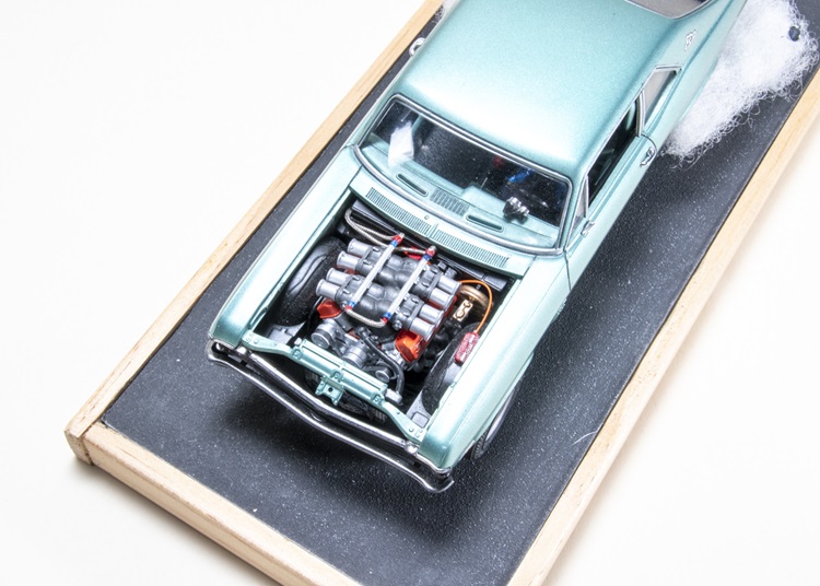 A tongue-in-cheek play on the Butch O’Hare’s ’70s theme, Tim modeled a Revell Deal’s Wheels van kit, added custom porthole windows, and dressed up the interior with a shag carpet and disco ball. Tamiya Black spray paint provided a good base for the “Love, American Style” logo Tim hand-brushed with DecoArt acrylic craft paints. “I chose the book as the base because I thought the title lent to the ’70s vibe,” Tim said.