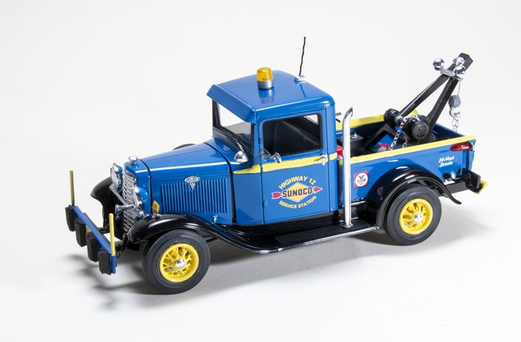 Terry scratchbuilt the bumpers on his AMT 1/25 scale 1934 Ford custom tow truck and wired the engine for good measure. In back, he placed accessories that you’d typically find on a wrecker. Testors enamels dress up the truck in the Sunoco blue and yellow with black fenders and running boards.