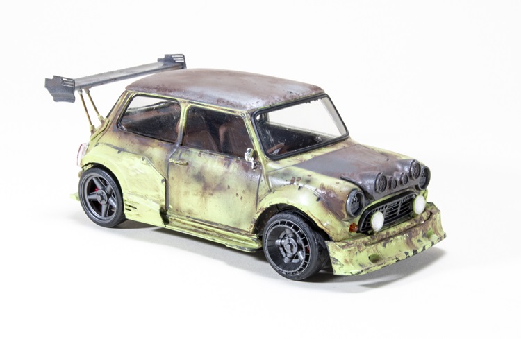 Gary had never modeled rust or weathering before and took the plunge with his pro touring Mini Cooper. He tricked out the Hasegawa 1/24 scale body with an aftermarket wide-body kit and painted with Scale Finishes colors. For weathering, he turned to craft paint and told himself to go for what he knew exposed metal looked like.